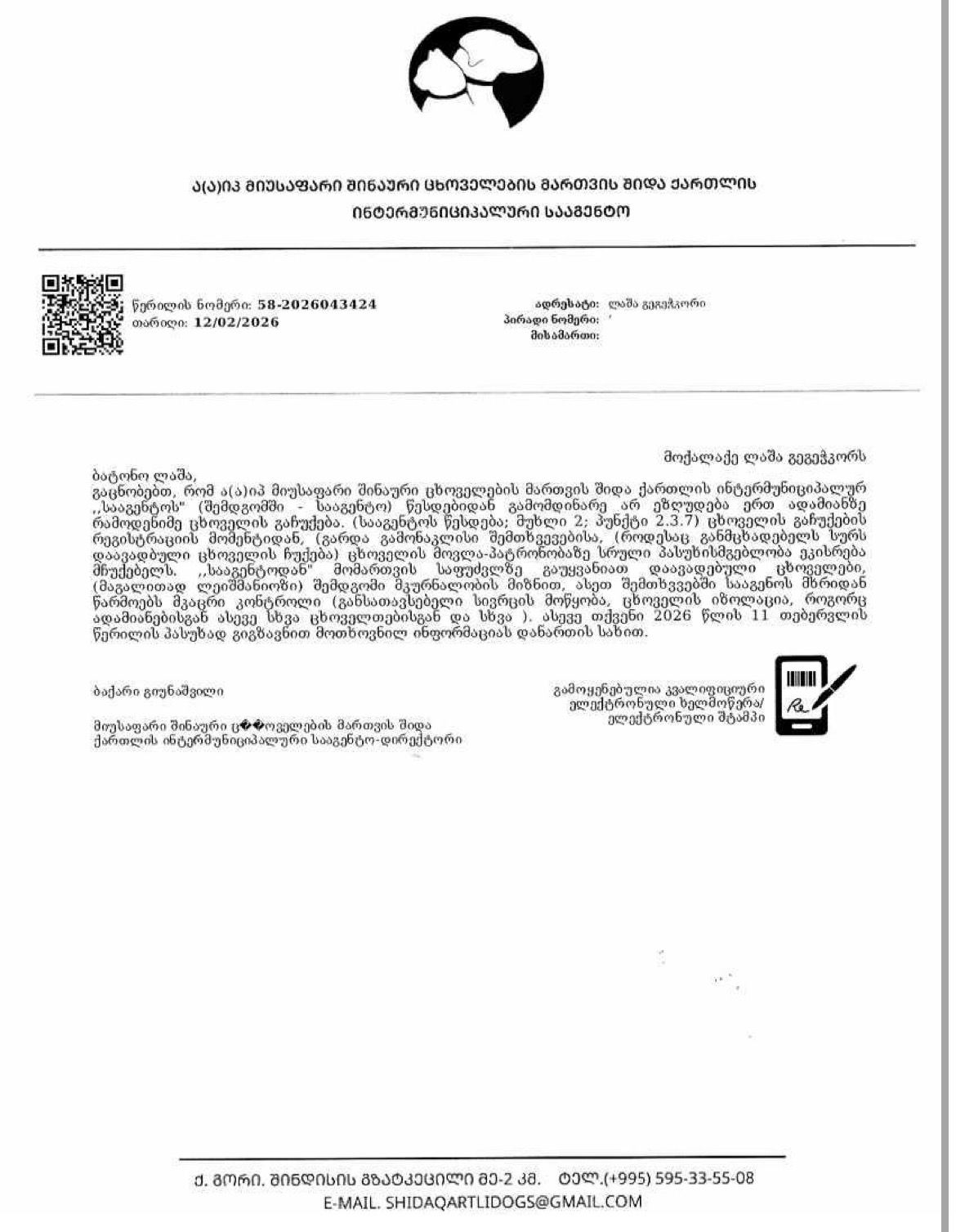 - 3. წერენ, რომ წესდების მიხედვით სააგენტოს არ აქვს უფლება ერთი და იგივე ადამიანზე რამდენიმე ცხოველი გააჩუქოს, - ეს არის სიცრუე! სააგენტოს დებულება/წესდებაში არ არსებობს არც ერთი მუხლი და პუნქტი, რომელიც კრძალავს ასეთ ქმედებას. პასუხი ცხოველთა უფლებების ზოგიერთი „დამცველის“ ცრუ ბრალდებაზე გაცემულია. ამიტომ, მოგიწოდებთ, თავი დაანებეთ სააგენტოს სახელის დისკრედიტაციას. იმ ორგანიზაციის, რომელიც 24/7 რეჟიმში ემსახურება მიუსაფარი ცხოველების ცოფზე აცრას და სტერილიზაცია/კასტრაციას“, - აღნიშნულია განცხადებაში, რომელსაც ლაშა გეგეჭკორი ავრცელებს.