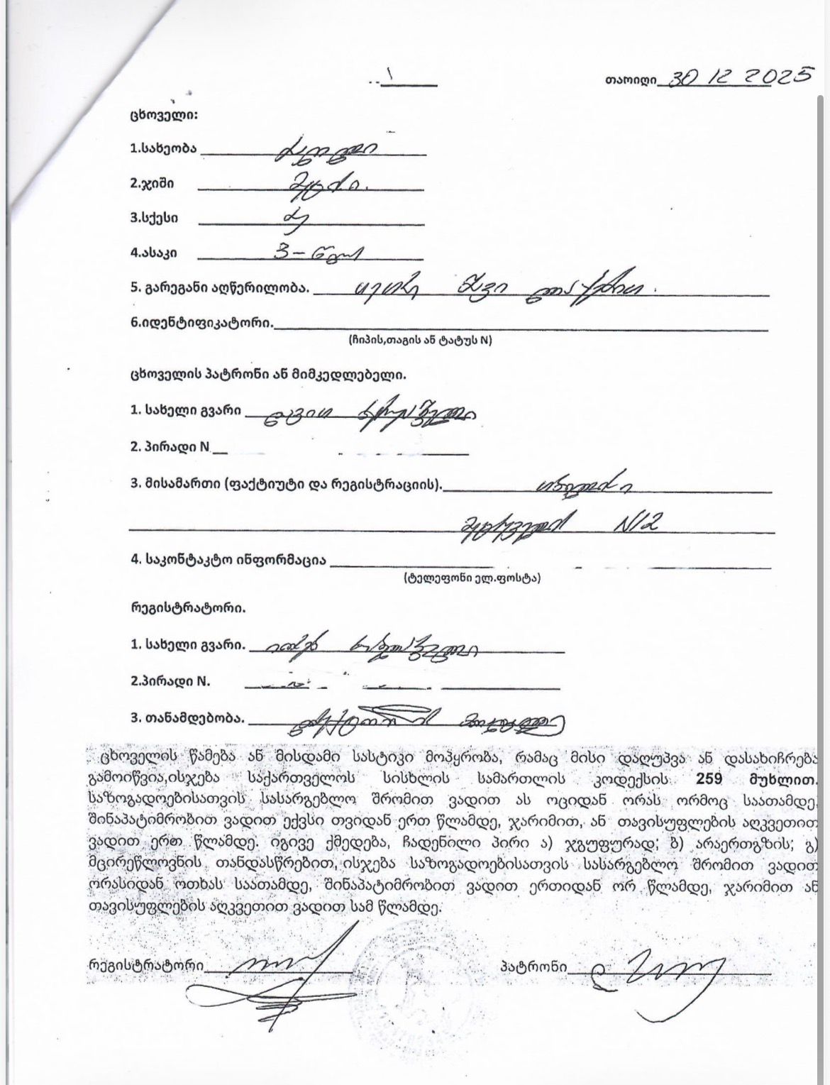- სააგენტოში შედგა ჩუქების ოქმი და მჩუქებელი გაფრთხილებული იქნა საქართველოს სისხლის სამართლის კოდექსის 259-მუხლის შესაბამისად. (ცხოველის წამება ან მისდამი სასტიკი მოპყრობა, რამაც მისი დაღუპვა ან დასახიჩრება გამოიწვია);
