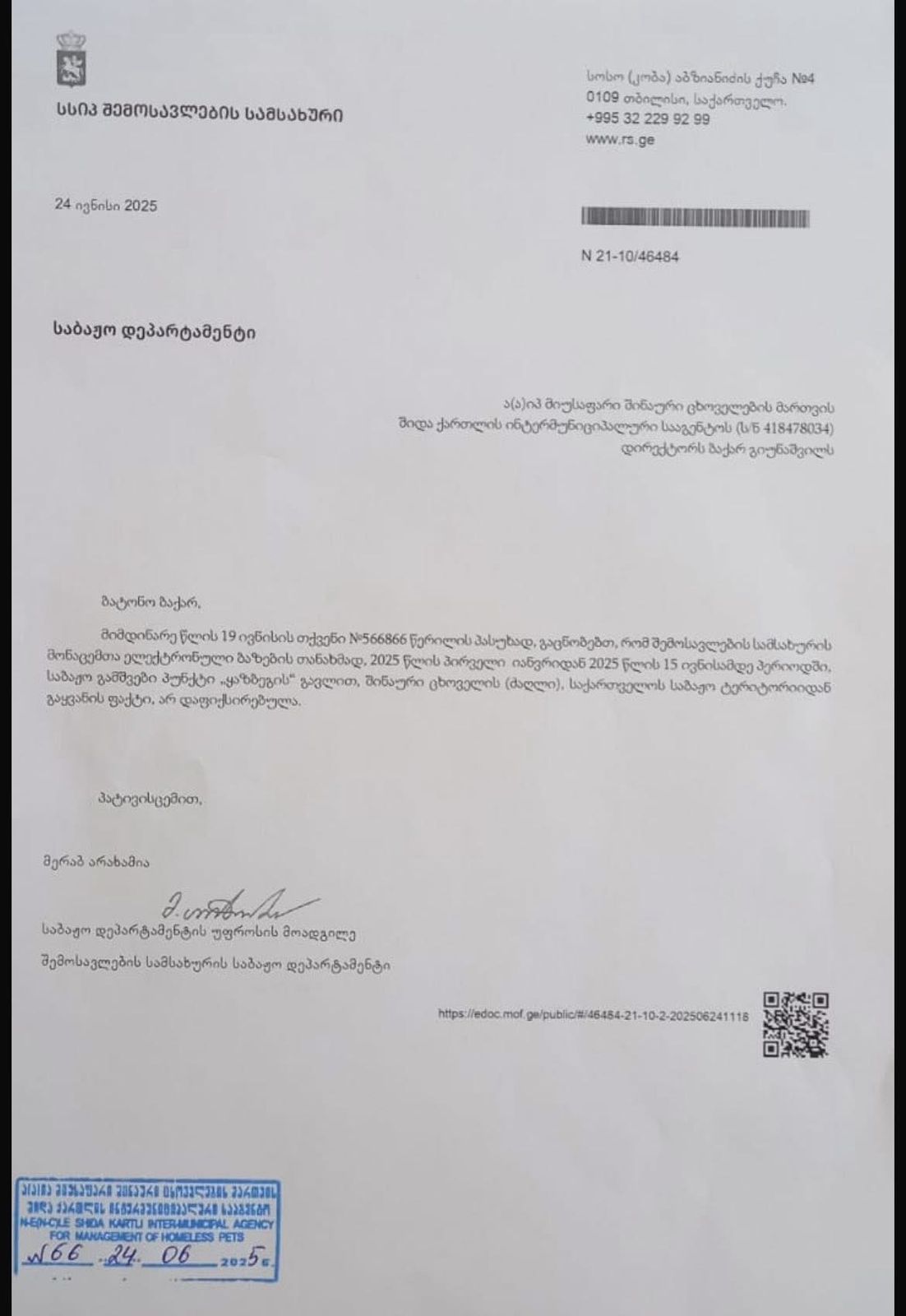- ის ვერც გაჩუქებული ცხოველების შემდგომ ბედზე იზრუნებს - ამ შემთხვევაში სრული პასუხისმგებლობა ეკისრება სააგენტოდან ცხოველის გამყვანს. სხვა შემთხვევაში ეს იქნება საბიუჯეტო სახსრების არამიზნობრივი ხარჯვა, რაც კანონით დასჯადია. სააგენტოს გვერდზე ყველას შეუძლია ნახოს, თუ როგორ აწარმოებს ორგანიზაცია მიუსაფარი ცხოველების გაჩუქების კამპანიას. ამ დროს: 1. წერენ, რომ არასამთავრობო ორგანიზაციებს აქვთ თავშესაფრების მონიტორინგის უფლება, - ეს არის სიცრუე! საქართველოს მთავრობის 2018 წლის 28 ივნისის N345 დადგენილებით თავშესაფრების სახელმწიფო კონტროლს ახორციელებს გარემოს დაცვისა და სოფლის მეურნეობის სამინისტროს სსიპ სურსათის ეროვნული სააგენტო. 2. წერენ, რომ 2025 წლის პირველ ნახევარში სააგენტოდან რუსეთის ფედერაციის მიმართულებით გაიყვანეს 1 000 ძაღლი, - ეს არის სიცრუე! საბაჟო დეპარტამენტიდან მიღებული პასუხის თანახმად, 2025 წლის 1-ელი იანვრიდან 2025 წლის 15 ივნისამდე პერიოდში საბაჟო გამშვები პუნქტი „ყაზბეგის“ (ლარსი) გავლით, შინაური ცხოველის (ძაღლი), საქართველოს საბაჟო ტერიტორიიდან გაყვანის არც ერთი (!) ფაქტი არ დაფიქსირებულა